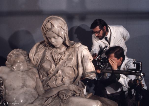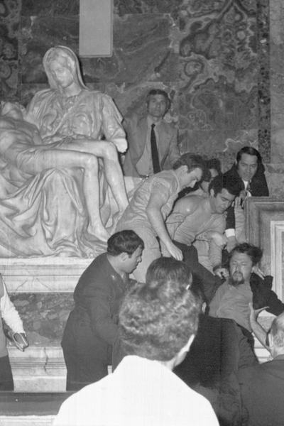 Majd a szoborra vetette magát, és 15 alkalommal sújtott rá kalapácsával. 10 hónapon keresztül dolgoztak a restaurátorok annak érdekében, hogy régi pompájában tündököljön ismét. Nehézséget okozott, hogy egyes turisták a lehullott darabokat összeszedték. Később volt, aki a bűntudattól vezérelve postán visszaküldte a Vatikánba, amit hazavitt. Nazzareno Gabriele restaurátor visszaemlékezésében elmondta, hogy öt hónapba telt csak a töredékek azonosítása.