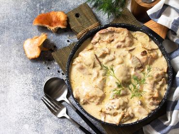 Dobd a hagymát és a felcsíkozott húst a forró zsiradékok keverékére, majd adj neki 10 percet. Ezután öntsd fel a borral, és ha elfőtt, mehet hozzá a gomba is. Ezzel is kapjon 5 percet, majd add hozzá a tejszínt, a barackot, a mascarponét és a fűszereket.