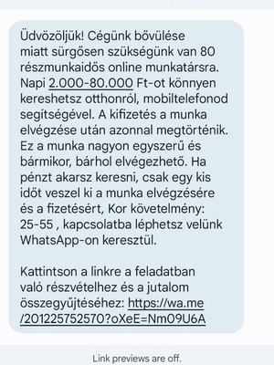 A feladók még az „otthonról végezhető munka 25–55 éves korosztálynak” csaliját is bedobják, majd azt kérik, hogy WhatsAppon keresztül vedd fel velük a kapcsolatot – és ekkor jön az a link, amelyre semmiképp nem szabad rákattintani.