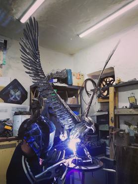 A műhelyben viszont állandó társa egy sas; annyira szereti, hogy nem adta el. Csupa kanál, villa és kés volt hozzá az alapanyag. Úgy 200 evőeszközt használt fel, csak a lábai készültek nagy méretű csavarokból.