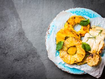 sült növényi sajt grillezett csilis-mézes ananásszal