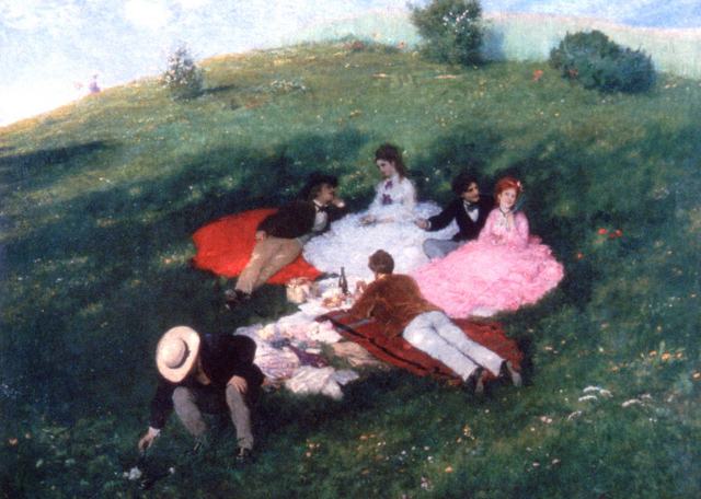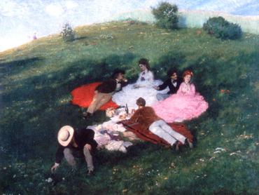 Ha rátekintünk a végül elkészült műre, szinte átsüt rajta keletkezésének története is. A társaság rangidős tagja, Arnold Böcklin ekkor már elismert művész volt, 45 esztendős, akiért az akkor 19 éves Probstner Zsófia igazán rajongott, bár családja egy másik úrral, a szintén jelen lévő Pulszky Ágosttal jegyzett el. A hölgy húga, Mária ekkorra már felesége volt saját gyámapjának, Szinyei unokatestvérének, Guldenfinger Gyulának, hogy egy örökösödési vita végére pontot tegyenek a házassággal. A fiatalasszony szíve azonban férje féltestvéréért, gróf Szirmay Albertért dobogott.