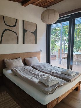 A házak belül visszatükrözik a természetet, mondhatni, beolvadnak a környezetbe, miközben gondoskodnak a kényelemről is. A fény- és levegőviszonyok kiválóak belül, köszönhetően a nagy üvegajtóknak, amelyeket elhúzva hatalmas, harmonikaszerű szúnyoghálók biztosítják a nyugodt bent tartózkodást. Tévézni is lehetett volna, de én inkább egy könyvet emeltem le a polcról, egészen más volt ezen a helyen átadni magam a szövegvilágnak.