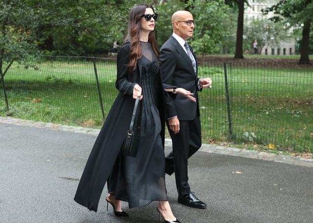 Ez egy érdekes, mivelhogy Anne Hathaway kezében két táskát is lefotóztak. Ez itt egy 760 ezer forintos Mark Cross, a másik pedig egy Coach modell. A ruha Khaite, a magassarkú Aquazzura, a napszemüveg Olivia Goldsmith.