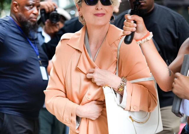 Meryl Streep ezt a Lanvin kabátot több jelenetben is viseli – ezzel életszerűbbé téve nyilván a filmet – egy másikban egy tűzpiros magassarkú körömcipőt párosítottak hozzá, ami