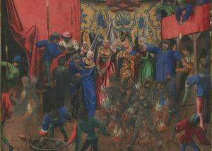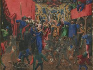 1393-ban egy udvarhölgy harmadik házassága alkalmából különleges mulatságot tartottak. Hat fiatal férfi, köztük a király, VI. Károly (más néven Őrült Károly) erdei vadembereknek öltöztek be: olyan jelmezt viseltek, ami gyantával átitatott bolyhos lenvászonból készült, és az arcukat is befedte, hogy tetőtől talpig bozontosnak és szőrösnek tűnjenek. A férfiak – akiket egy lánccal is összekötöztek, amit csörgethettek - farkasként őrjöngtek, obszcén dolgokat műveltek, és megpróbálták rávenni a közönséget, hogy találja ki, kit rejt a szőrös jelmez. A király öccse ekkor, figyelmen kívül hagyva a tilalmat, miszerint fáklyával tilos a terembe lépni, az egyik táncos arca fölé tartotta az égő fáklyát. Egy kihulló szikra gyorsan lángra lobbantotta a szerencsétlen férfi jelmezét, és az összekötözött férfiak mindegyike meggyulladt. A királyt csak az mentette meg, hogy egyik nagynénje terjedelmes szoknyájával eloltotta a lángokat. Négy táncos szörnyethalt, az ötödik pedig úgy maradt életben, hogy egy borral teli dézsába ugrott.