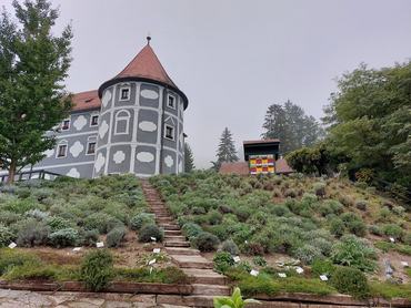 A 37 méter magas kilátó tetejéig is lépcső használata nélkül juthatunk el, a lefelé vezető út pedig lehet nagyon is gyors, ha a kilátó belsejében kanyargó csúszdát használjuk filcszőnyeggel, két euró megfizetése mellett.