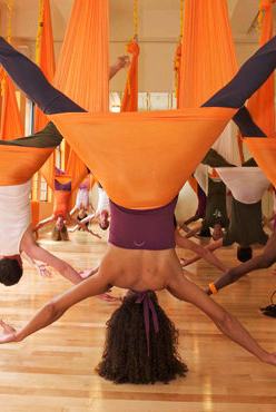 A plafonra erősített erős és széles selyemszalag segítségével maradnak a levegőben a manhattani Om Fatory Yoga Center antigravitációs jógájának gyakorlói. Az új sportot Christopher Harrison légtornász fejlesztette ki hagyományos jóga elemekből, mert azok túlságosan igénybe vették a sérült csuklóját, amit nem bírt.