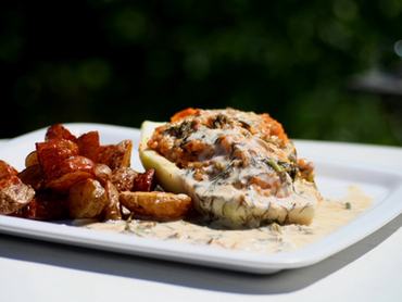 Ha minden alkotóelemmel megvagyok, összeállítom az ételt. A tökcsónakokat megtöltöm a rizses húsos raguval, mindegyiknek a tetejére teszek egy kis merőkanálnyi kapormártást és előmelegített 170 fokos sütőben kb. 20 perc alatt átsütöm. Tálaláskor mindenki kap egy fél tököt, amit sült újkrumplival körítek, és tetszés szerint lehet még mellé kapormártást enni.