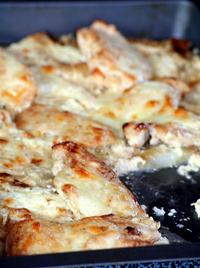Abban a zsiradékban (ha nincs elég, a maradék vajból teszek még hozzá), amiben a csillagtök sült, kisütöm a szeletekre vágott, sóval, borssal ízesített csirkemellet is. A húst elrendezem a patisszon tetején, meglocsolom a sütéshez használt vajjal, majd minden hússzeletre rakok egy szelet mozzarellát. Az öntethez a tejfölt a reszelt sajttal, áttört fokhagymával, sóval, szerecsendióval kikeverem, majd elosztom a csirke és a csillagtök tetején úgy, hogy mindenhova jusson.A tepsit 170 fokra előmelegített sütőbe tolom, és kb. 25 perc alatt készre sütöm az ételt. Aki nagyon éhes, készíthet mellé párolt rizst.