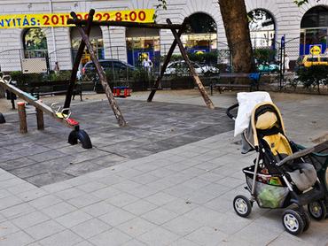 Ó, azok a gyönyörű gondolatok a Podmaniczky utca sétálóutcává varázslásáról... (mert ilyenek is voltak) hát, valószínűleg soha senki nem is gondolta komolyan. Viszont ide álmodott az önkormányzat egy olyan játszóteret, ahol hintázni csak akkor szabad, ha nem jön a troli (különben Pistike konkrétan beszállhat a buszba, ha nyitva van az ablak), ahol a kutyáknak a térre több joguk van, mint bármilyen gyereknek, és ahová csak olyanok viszik a gyerekeiket, akik végső kétségbeesésükben menekülnek a három hete ebédre érkezett anyós elől. És ők is sietve távoznak.