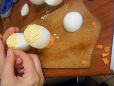 Először is számolja ki, hogy hány tojásra lesz szüksége, mert arra számítania kell, hogy egy csibe töltelékhez legalább két tojás sárgáját kell felhasználnia. Ezt a mennyiséget főzze keményre, várja meg míg langyosra hűlnek, majd pucolja meg őket.