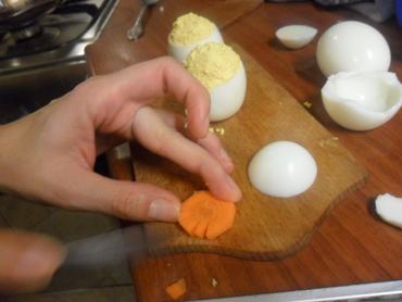 Ezután válassza külön azokat, amelyeket szépen, simán meg tudott pucolni, ezekből lesz a csibék teste. A többiből vegye ki a tojássárgát és tegye egy keverőtálba, a fehérjéket meg nagyon kicsire aprítsa fel. A félretett, szép tojások aljából vágjon le egy-egy vékony karikát, hogy majd egyenesen és biztonságosan tudjon állni a répa-lábakon a kiscsibe.