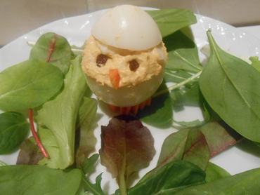 A tojások sárgáját törje össze egy villával (a félrerakott sárgákkal együtt), és keverjen bele annyi tejfölt és mustárt, hogy krémes legyen, de ne túlságosan, mert akkor nem fogja tudni megformázni a csibe fejét. Én 3 tojássárgájához csak két teáskanálnyi tejfölt és egy teáskanálnyi mustárt tettem. Ezután ízesítse sóval, esetleg borssal.