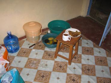 Egy hullámpala tetejű, de - gondolom - agyagból készült falú szobám volt, ahova, ha jött az eső, be-becsurgott a víz. Mosdáshoz, fürdéshez, fogmosáshoz kaptam vizet, ivóvizet viszont mindig a nagy bevásárlóközpontból kellett hazacipelni, ami nem kis munka volt a 10-20 literes hordókkal. Sok kis helyi bódéban lehetett venni gyümölcsöt-zöldséget, amit általában fél óráig áztattam egy kis klóros vízben. Ezt a fél órát egy idő után néha megspóroltam, de nem tudom, hogy a hasfájásom emiatt lehetett-e...