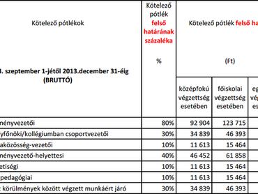 - Megváltozik a pótlékok rendszere. Egyes pótlékok megmaradnak, például az intézményvezetői és osztályfőnöki pótlék, ezek alsó és felső határa meghatározott. Azt egyelőre nem tudják az általalunk megkérdezett tanárok, hogy például ki dönt arról, hogy a 10-30 százalék közötti osztályfőnöki pótlékból ki mennyit fog megkapni. Ez egy főiskolát végzett pedagógusnál 15 és 46 ezer forint között változhat, egyetemi végzettségnél pedig 17 és 50 ezer forint között.