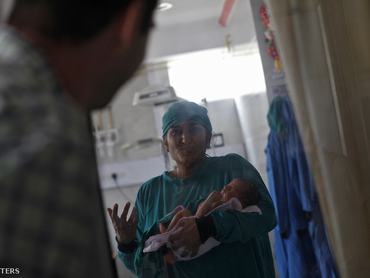 Anand, India, szeptember 30. A zöld műtősruhába öltözött brit restaurátor, Rekha Patel öleli újszülött lányát az Akanksha Klinikán észak-nyugat Indiában, férje, Daniel egy üvegajtón át mosoly rájuk.