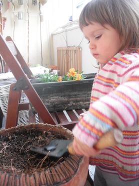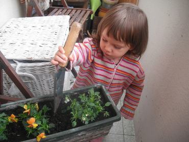 Legkézenfekvőbb pár virágpalánta beszerzése; kora tavasszal és késő ősszel ültethetünk árvácskát, ami az enyhébb fagyokat is kiállja, emellett szinte minden talajban megél. Ha már a nyárra gondolunk, érdemes petúniát, mézvirágot vagy büdöskét beszereznünk, ezek nevelgetéséhez nem kell profinak lenni, és az ültetés is egyszerű. Akkor érhetjük el a legszebb eredményt, ha a virágzás időszakában pár naponta leszedegetjük az elvirágzott virágokat; nagyszerű relaxációs program a nap végén ez a művelet, közben átbeszélhetjük a gyerekkel a napközben történteket is.