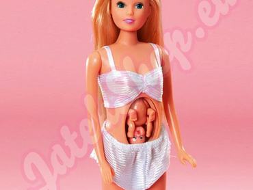 Egyáltalán nem szerettük volna kihagyni a felsorolásból ezt a darabot sem, még akkor sem, ha ezt nem a Mattel dobta a piacra, hanem a Simba Toys. Ez az egyik legszomorúbb dolog, amivel valaha találkoztunk a darázsderekú, hosszú hajú, mindig a topon lévő barbibirodalomban. Tudjuk, hogy csak szemléltetni szerették volna, hogy a gyereket nem a gólya hozza, de akkor már nem lett volna életszerűbb, ha nem egy csontsovány (a hasát leszámítva, bár az is lehetne nagyobb), bárgyú szemű, agyonsminkelt női testbe préselik bele azt a szerencsétlen gyereket? És az egészet még csak tetézik azzal a kimondottan gusztustalan fehérneművel amit a szőkeségre aggattak.