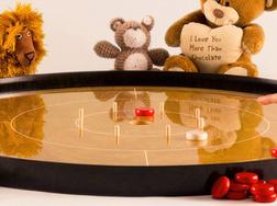 Végére hagytam a Crokinole-t. Ez az a játék, ami könnyen függővé tesz. Emellett töltötték a gyerekeim a legtöbb időt a Társasjátékok Ünnepén. A játék egyszerű, korongokat kell pöckölni egy táblán (méretük változó, mi például egy kb. 1 méter átmérőjű pályán játszottunk). A feladat, hogy a saját korongunkat minél közelebb juttassuk a középponthoz, és tartsuk azokat a belső körben.