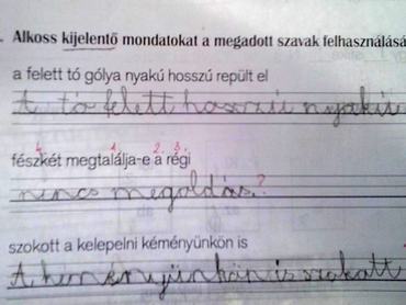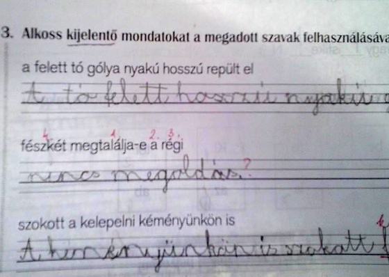 És a kérdés: hogyan csinálunk KIJELENTŐ mondatot abból, hogy "fészkét megtalálja-e a régi"? Önök tudják? Vagy ez direkt ilyen beugratós dolog, aminek az a megoldása, hogy nincs megoldása? És miért tett kérdőjelet a pirossal javító entitás (tanár?) a nincs megodás mögé? És miért számozta be pirossal a szavak sorrendjét, ha az így létrejött alakulat egy kérdőmondat lesz?