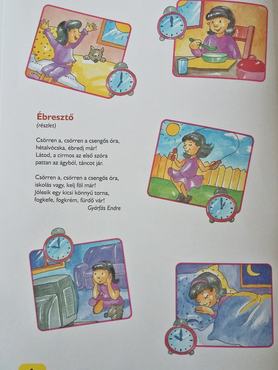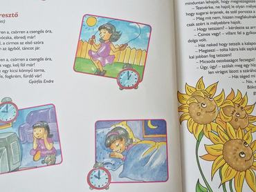 Az Ébresztő című vers részletének illusztrációja egy kisgyerek napirendjének a fontosabb állomásait mutatja be, meglehetősen liberális felfogásban. A képen a kislány reggel hétkor ébred, majd délben ebédel, ez még rendben is van, reális lehet.