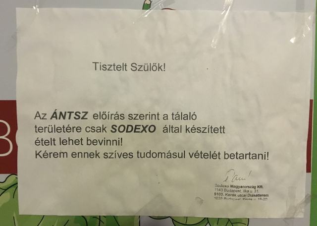 Az ebédlő ajtajára ugyanis ki van írva, hogy a helyszínen csakis az ottani étkeztető által nyújtott menzakaját lehet elfogyasztani, mást nem. Vagyis hiába adnám a fejem napi főzésre, amit a kölök behordana magával a suliba (és ami úgy hiányzik nekem, mint mókusnak az erdőtűz), és még fölöslegesebb lenne máshonnan ételt rendelni, úgysem ehetné meg az iskola éttermében a többiekkel. Pedig senkinek nem kötelező befizetni a menzaebédre.