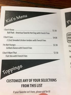 A helyzetnek persze léteznek frappáns megoldásai (kommentben kérjük a javaslatokat), és mi is találtunk egy jópofát a minap a Bored Pandán. Alighanem a gyermeklélek nagy ismerői dolgozhatnak abban a pennsylvaniai étteremben, ahol kifundálták az alábbi étlapot.