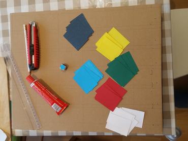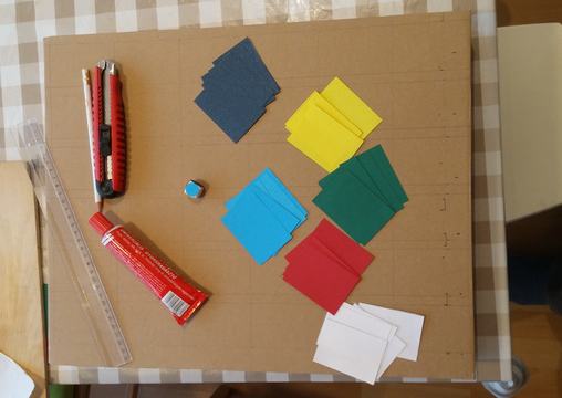 Hat, különböző színű pályát kell festenünk vagy ragasztanunk, valamint egy dobókockát, amelynek oldalait ugyanilyen színekkel jelöljük. Mi színes papírokkal dolgoztunk (lásd fotók), de akinek szimpatikusabb, meg is rajzolhatja a pályákat filctollal vagy festékkel.