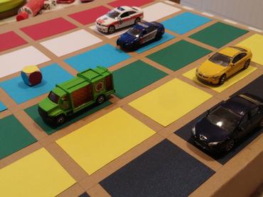 Az elkészítéshez szükséges: kartonlap, színes papírok és ragasztó (vagy festék, vagy filctoll), dobókocka, hat darab, különböző színű autó (vagy más bábunak való, amiből van otthon vagy elő tudunk állítani hat különböző színűt).