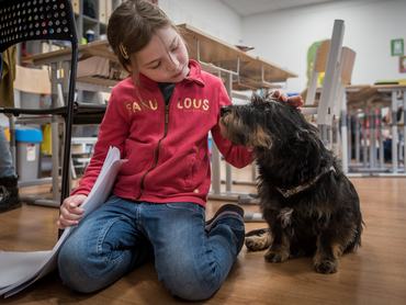 Az iskolában három kutya is segíti az oktatást, mindhárman Helga kutyái. Egy agár, egy szálkás szőrű tacskó és egy vizslakeverék. Helga elmondja, hogy a gyerekek nem nyúzzák a kutyákat, akik azért így is hihetetlenül elfáradnak egy-egy „munkanap” után. Egy nap általában egy kutya van a gyerekekkel. Ők nem terápiás kutyák, ők „csak” jelen vannak a teremben: ezt nevezik állatasszisztált oktatásnak, ami egyedülálló Magyarországon.
