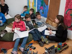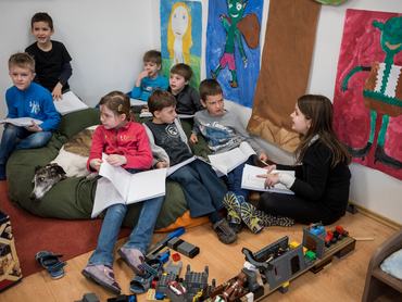 Közben átmegyünk a második osztályosokhoz, ahol egy maréknyi gyerek fogad egy hatalmas babzsákon fekve, középen Fürge, az agár terpeszkedik. A gyerekek minden rezdülését figyelik, és próbálnak kedvére tenni.