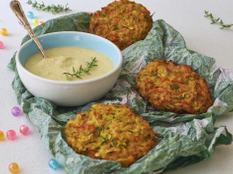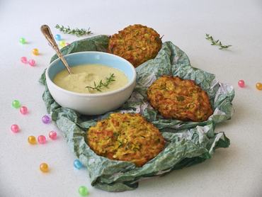 Ez a változat cukkiniből, sárgarépából és kápiapaprikából készült, így többféle szín, íz és textúra keveredik. A szósz még inkább trükkös. A kiindulópont az volt, hogy bár egyéves kortól, a tojás bevezetésével elméletileg adható a gyerekeknek majonéz, mégis a nyers tojássárgája sok olajjal kikeverve nem tűnik a legjobb nyári betevőnek ebben a korban.