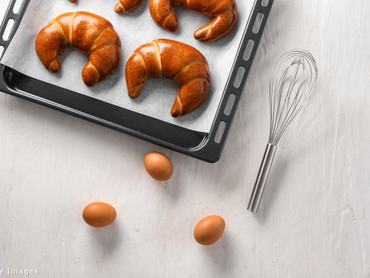 A tésztából háromszögeket vágunk és feltekerjük. Sütőpapírral bélelt tepsire tesszük, tetejét megkenjük felvert tojással és 175 fokra előmelegített sütőben kb. 15 perc alatt készre sütjük.