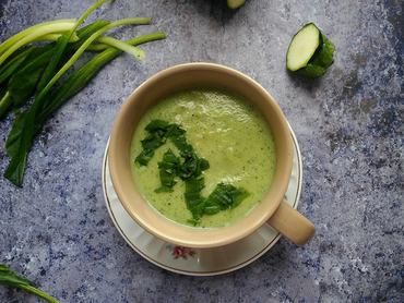 Felhevítjük a kókuszzsírt, majd lepirítjuk benne a zúzott fokhagymát és az apróra vágott medvehagymát. Sózzuk, beledobjuk a kockázott cukkinit, jól összeforgatjuk. Megvárjuk, míg a cukkini is megpirul, majd felöntjük annyi vízzel, ami épp ellepi. Fedő nélkül 15-20 perc alatt puhára pároljuk. Ízesítjük szerecsendióval, felöntjük kókusztejjel, összeforraljuk. A lángot elzárva hagyjuk hűlni, majd botmixerrel pürésítjük. Ízlés szerint és diétánknak megfelelően friss medvehagymával, pirítóssal vagy krutonnal tálaljuk.