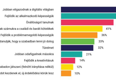 A két legfontosabb hozadéka az elmúlt időszak viharainak: a válaszadók 56 százaléka sokat tanult ebből a nehéz időszakból, másrészt több lett a beszélgetés és a figyelem a családokban. A gyerekek önállóságot tanultak és jobban megbarátkoztak a digitális térrel. A legnagyobb veszély, amelynek a gyerekek hosszú távon is viselhetik az utóhatásait, és muszáj foglalkozni vele, az a társak és barátok hiánya. A magyar szülők legnagyobb aggodalma (10-ből 8 válaszadó említette), hogy a gyerekek elvesztették a kapcsolatot a barátaikkal, sőt 10-ből 5 szülő az elmagányosodást, elszigetelődést azonosította legkritikusabb hosszú távú veszélyforrásként a gyerekek életében.