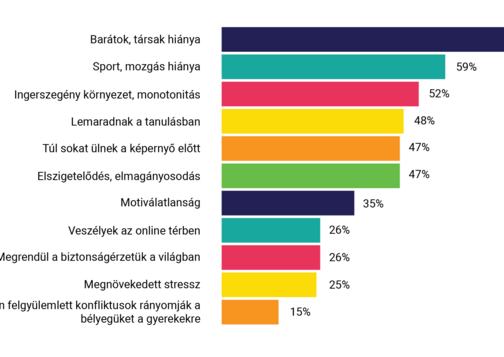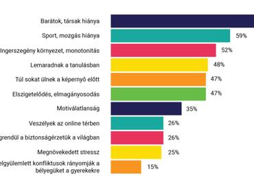 Az elmúlt időszak magasan legnagyobb veszélye, amely hosszú távon is érintheti a gyerekeket, a barátok hiánya (81 százalék). De emellett toplistás lett a mozgáshiány, a monotonitás és az ingerszegény környezet, és a túl sok képernyőhasználat (érdekes módon ettől aggódnak a szülők, mégis kevesen korlátozzák, minden negyedik családban vannak erre vonatkozó elvek). A szülők 48 százaléka aggódik, hogy a gyerekek lemaradtak a tanulásban, és a szülők mintegy negyede tart attól, hogy a gyerekének megrendült a biztonságérzete a világban.