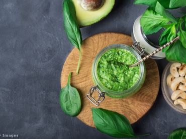 Szép színes, egészséges vegán ételek készíthetők az avokádópesztóból. Glutén-, tej-, tojásmentes, vegán recept.
