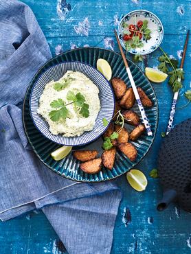 Mossuk meg a korianderzöldet és a mentát. Alaposan rázzuk szárazra, majd a leveleket lecsippentve aprítsuk durvára. Tisztítsuk meg a fokhagymát, és szintén aprítsuk durvára. Tegyünk mindent egy magasabb falú mixeredénybe, majd adjuk hozzá a lime-lét és a tofut.
