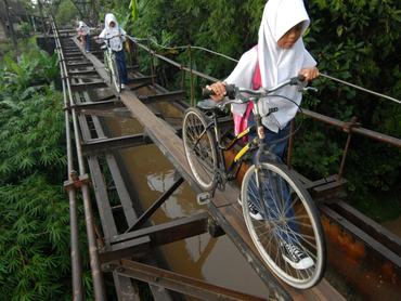Annak a jávai dzsungelben élő kisgyereknek, aki az iskolába szeretne eljutni, egy 100 méter hosszú függőhíd keskeny fapallóján kell átkerékpároznia, ami 30 méter magasan ível át a folyó fölött. Az iskolások az életüket kockáztatják, hiszen a biztos halál vár rájuk, ha véletlenül megcsúsznak a vékony deszkán.