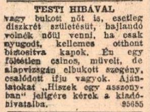 (Úri fiú jeligére.) Vagy Tüzes szempár ajánlata: „URAIM! Egy rendkívül csinos, szép fiatal úrileányka óhajtja a barátságát azon előkelő gavallér úriembernek, ki hajlandó őt azonnal kisegíteni.” Ezek a hirdetők alig burkoltan jelezték, hogy szexuális szolgáltatást nyújtanak pénzért cserébe, de természetesen olyan is akadt, aki szexelni szeretett volna, pénze viszont nem volt rá: „KÖZÉPTERMETŰ 45 éves jómodoru férfi vagyok, intim barátságát keresem oly hölgynek, kit e lépésre nem anyagi érdek vezényel, hanem kölcsönös egymást megértés, kivel hetenkint egyszer a fővárosban találkozhatnék.” Miki 1932-ben viszont legalább humoránál volt: „Templom egere esti cincogásokhoz csinos partnernőt keres.”
