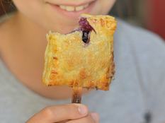 Bolti vajastésztából készül ez a turbódesszert, benne gyümölcsök. A gyerekek kedvéért még pálcára is húztuk.