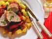 Először kéreg, aztán gyorsan megsütjük a krumpival, addigra pont el is készül mellé a karamellizált lecsó. Pikk-pakk lakoma.