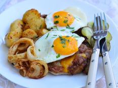 Egy szelet gyorsan kisütött tarja, rá egy tükörtojás, mellé krumpli és sült hagyma, ha a pasikat kérdezzük, ez felér egy szerelmi vallomással.