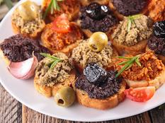 Még egy vendégváró, amit éppen annyira tálalhatsz néhány csomag grissini mellett, mint amennyire illik kiflifalatkák tetejére egy-egy apró falat aszalt paradicsommal megkoronázva. Ha mozzarellagolyókat is teszel rá, akkor egy fogpiszkálóval érdemes átszúrnod, hogy az olívás tornyok biztonságosan álljanak.