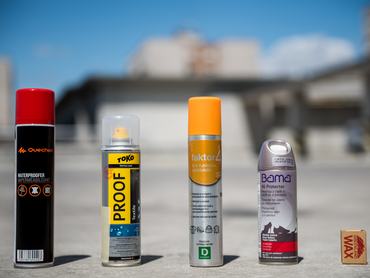 Négy helyről szereztünk be olyan impregnáló készítményeket, amelyeket textilre is lehet alkalmazni. A CCC, Dechatlon, Hervis és Deichmann áruházakban vásároltunk be, ebből egyik helyen mondta azt az eladó, hogy ő ebben az egészben nem hisz, de azért vigyünk, ha van felesleges pénzünk arra, hogy egy textilt vagy egy vászoncipőt vízhatlanná tegyünk. Ahol több típus között lehetett választani, ott az arany középutat választottuk, illetve mivel az elég menő színű táskámat szándékoztam tönkretenni impregnálni, így a Deichmannban azt vettük meg, ami állítólag színvédő is, illetve a Frajllraven táskához járt egy kis kocka vaksz is, ezzel tehető egyébként vízállóvá a táska.