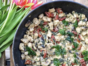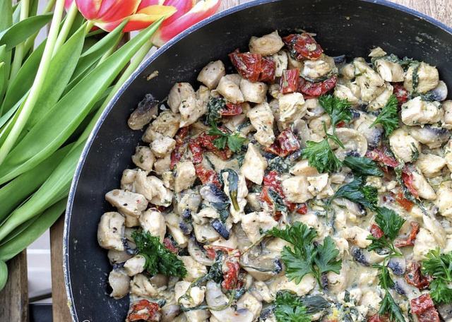 "A csirkét fedő alatt puhára pároltam. Hozzáadtam a paradicsomot, spenótot és a felszeletelt gombát. A natúr joghurtot befűszereztem, majd hozzáöntöttem a csirkéhez. Amikor az egész összefőtt, levettem a tűzről, pihentettem 5 percig, majd hozzákevertem a 3 tojássárgáját, amitől szép, krémes állaga lett" - árulta el az edző.