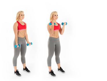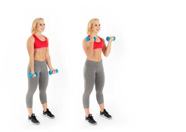 – Emeld a súlyokat a vállad felé úgy, hogy közben a bicepszre feszítesz, majd vissza az alaphelyzetbe.
