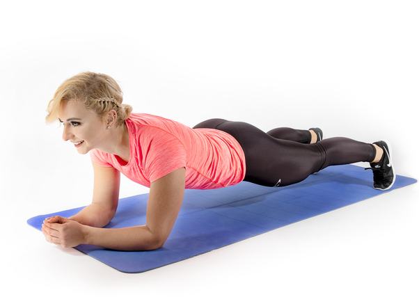 – Engedd le magad, majd emeld fel a tested a padlóról. Eközben tartsd lent a kezed, a tested egyenes vonalban emelkedjen fel a fejedtől a lábadig. Tartsd meg a hasad, ne engedd, hogy a csípőd túl magasra vagy alacsonyra menjen. Könnyített verzió, ha leteszed a térded.