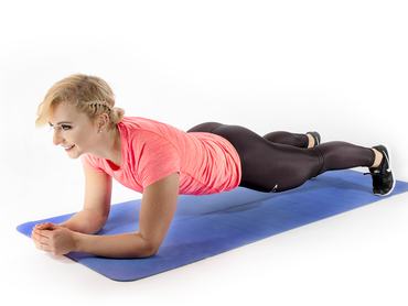 – Kezd el a plank pozícióját úgy, hogy az alkarod vállszélességben helyezkedik el a talajon, eközben az egész tested feszesen tartod. A hátad egyenes, a fenekedet se nyomd ki! A gyakorlatvégzés alatt végig szívod be a köldököd, feszíted a törzsed. Könnyített verzió, ha leteszed a térded. Tartsd 30 másodpercig!
